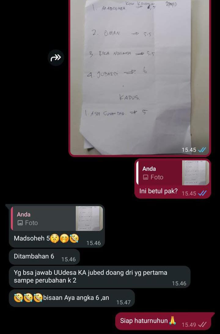 Seleksi dimaksud mencakup formasi Kepala Urusan (Kaur) Keuangan dan Kepala Dusun (Kadus) III, Sejumlah peserta yang dinyatakan tidak lolos mengaku menemukan kejanggalan dalam hasil penilaian, termasuk adanya perubahan angka nilai dari lima menjadi enam pada dokumen hasil seleksi.